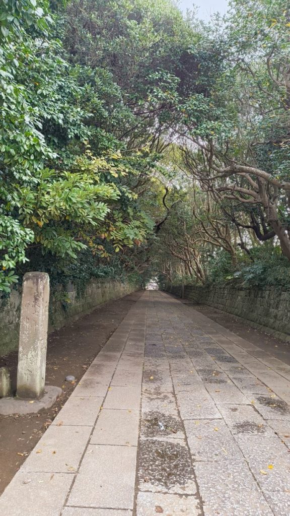 パワースポットの長い参道は常緑広葉樹で青々としてます。