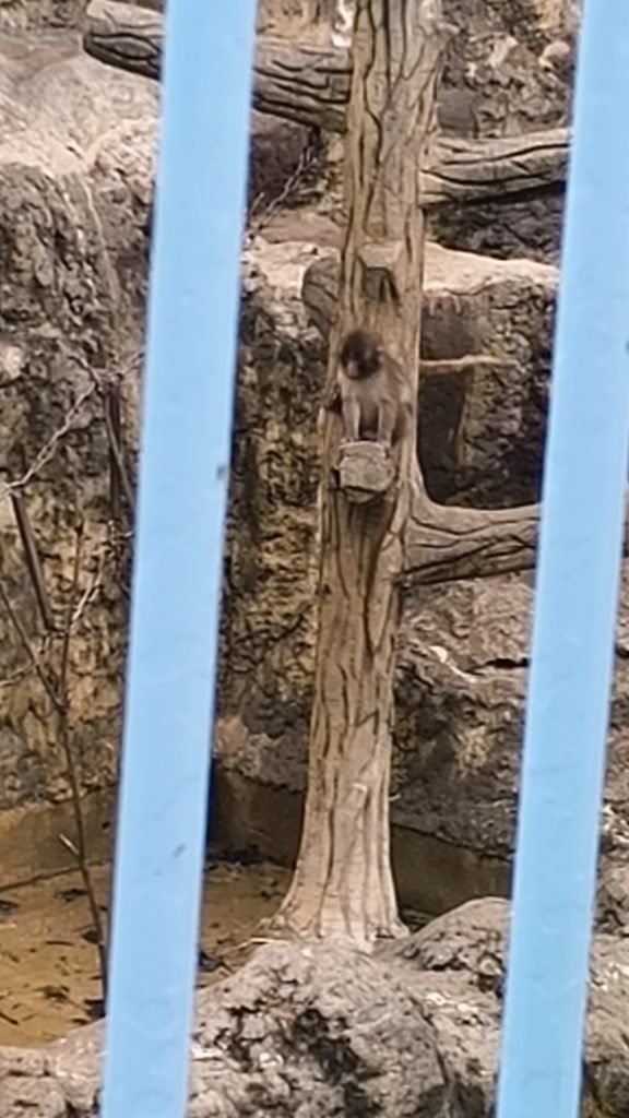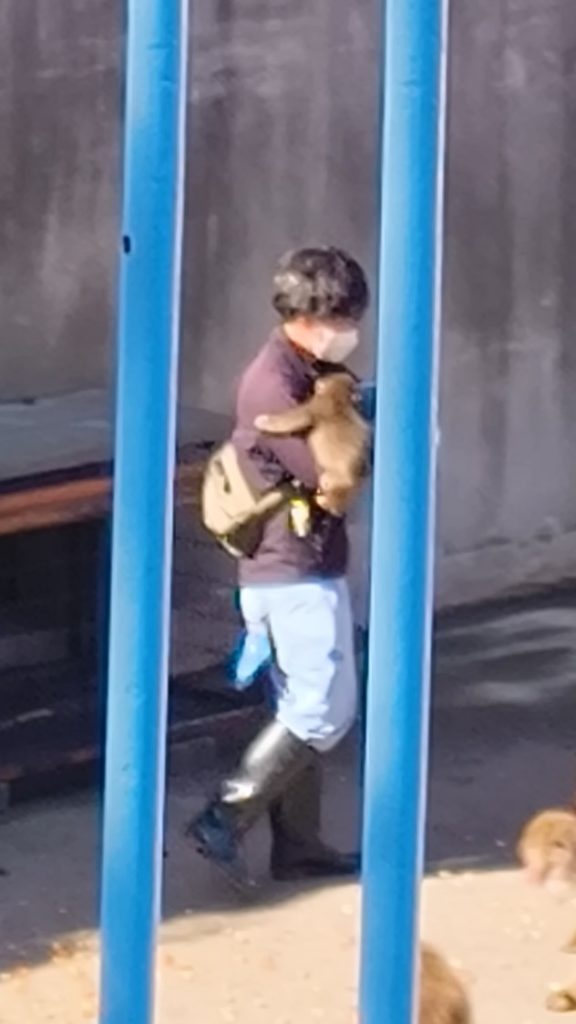 市川動植物園。人気のパンチくん! 飼育員さんにしがみついていました!